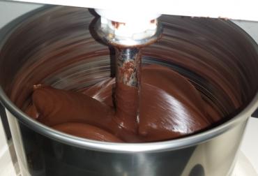 Los nibs se muelen hasta convertirse en licor de cacao líquido, el cual se almacena en tanques térmicos o se transforma en bloques solidos (tabletas de chocolate).