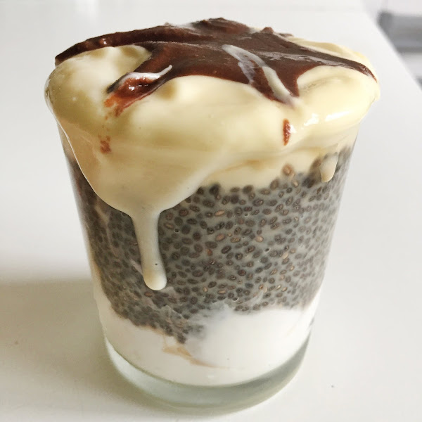 Este vasito lleva: requesón desnatado en el fondo, semillas de chía hidratadas con café con leche, queso batido de vainilla y una chucharadita de mantequilla de cacahuete con cacao... ¡Para chuparse los dedos estaba!