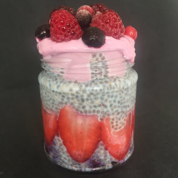 Y ésta segunda opción lleva: arándanos en la base, fresa en láminas, pudin de chía en leche desnatada, queso batido desnatado con arándanos, y frutos rojos para coronarlo. Estaba tan rico como bonito quedó.