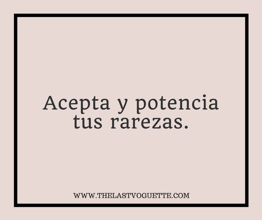 Es correcto ser y sentirse diferente. Si alguna vez te dijeron que no, se equivocaban. Todos somos como somos y debemos aceptar nuestras rarezas e imperfecciones. Somos así y es maravilloso que seamos tan distintos. Tu mayor rareza te diferencia, aunque tú la odies. Acéptala, aunque te lleve tiempo, y aprovéchate de ella.