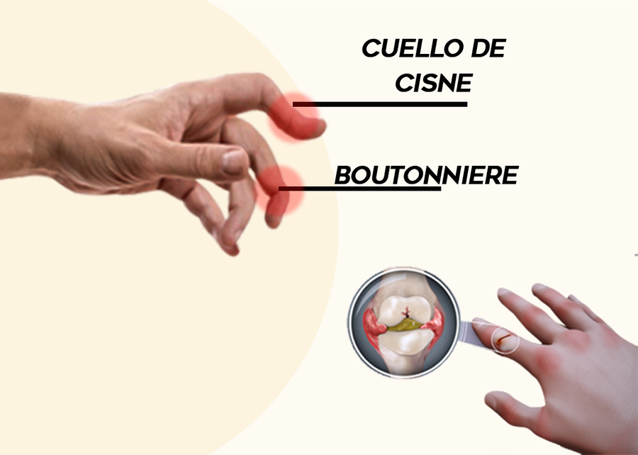 Las deformaciones son más frecuentes en manos y pies, pero pueden extenderse a articulaciones más grandes. Más del 10 % de los pacientes que no cuentan con un tratamiento desarrollarán deformidades de las pequeñas articulaciones de las manos en los primeros 2 años. Se producen por la pérdida de cartílago como resultado de la degradación enzimática y mecánica y el estiramiento y debilitamiento de ligamentos. Las deformaciones frecuentes que ocurren en las manos son las de Boutonniere y la deformación del cuello de cisne. Lamentablemente, las deformaciones son permanentes, por lo cual es importante iniciar un tratamiento temprano para prevenirlas.Los nódulos son elevaciones que se presentan sobre huesos o zonas cercanas a articulaciones y representan otras complicaciones que se dan en la artritis. Estos pueden disminuir la movilidad e impedir la flexión y extensión de los dedos de la mano y pueden complicarse impidiendo finalmente el movimiento (6)