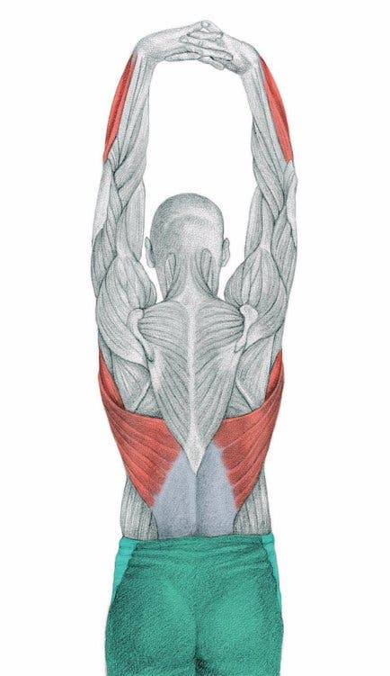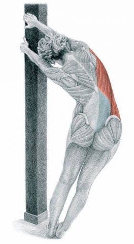 Se puede realizar un estiramiento unilateral del dorsal ancho en la misma posición pero realizando una inclinación lateral o latero-flexión contralateral al músculo a elongar.