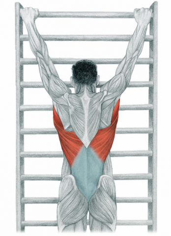 Estiramiento también muy efectivo para estirar los músculos dorsales, en este ejercicios se estira con mayor potencia la inserción humeral por la tracción potente que se realiza con la suspensión por el agarre de las manos en las espalderas.