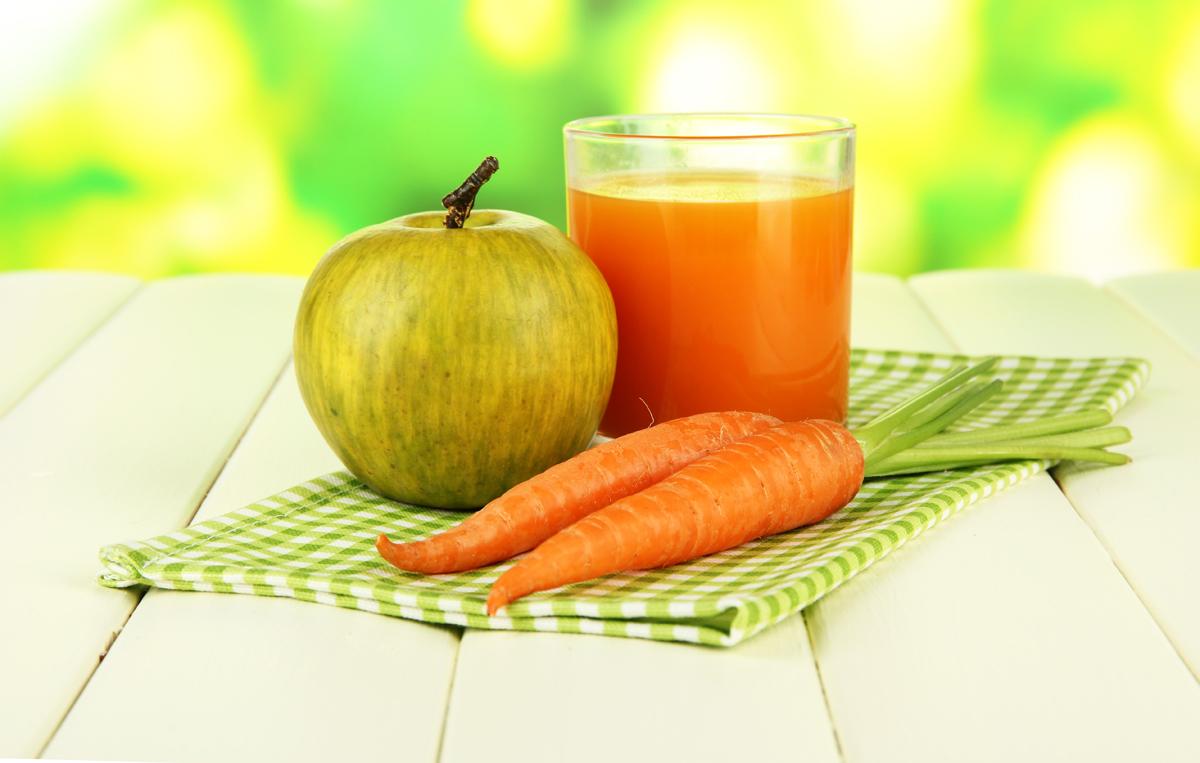 Lavamos la manzana y la cortamos en cuartos. Pelamos 2 zanahorias y las añadimos a la licuadora con la manzana. Licuamos y bebemos rápidamente para aprovechar al máximos los beneficios.
