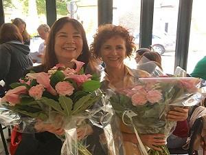 Tuve la gran oportunidad de ser su traductora al inglés, aquí estamos celebrando los bellos ramos de flores con los que fuimos obsequiadas.