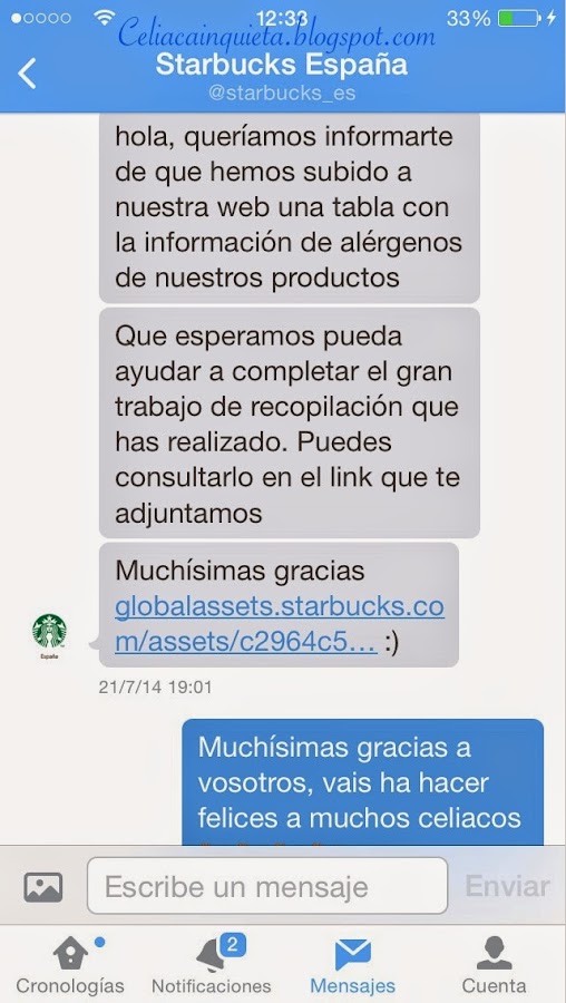 Hace 2 semanas se celebraron las Jornadas de FACE JOVEN en Madrid a las que yo no pude asistir porque estoy en casa por baja medica. Gracias a gente que estuvo allí me enteré que en una de las mesas redondas que se realizaron, donde participaba entre otros el encargado de calidad del Grupo VIPS, se habló de mi blog. El motivo fue que algunos asistentes se quejaron al representante del Grupo VIPS sobre la desinformación que existe en sus locales, especialmente en Starbucks, sobre los productos sin gluten. Durante esta discusión, alguien dijo que en mi blog había una entrada (link a la entrada) con la lista de las bebidas aptas para celiacos que elaboré tras mucho trabajo ya que tuve que ponerme en contacto con ellos en numerosas ocasiones. Este comentario no debió de hacerle mucha gracia al representante del Grupo Vips que se puso a la defensiva tirando mi trabajo por tierra diciendo que ellos se habían puesto en contacto conmigo para indicarme que mi trabajo de recopilación no era correcto. Pues bien, como odio las mentiras os voy a poner a continuación la única conversación que tuve con Starbucks en privado (vía twitter) en la que no solo me agradecen "el gran trabajo de recopilación realizado" si no que además a partir de ese momento deciden subir la tabla de alérgenos a su web.
