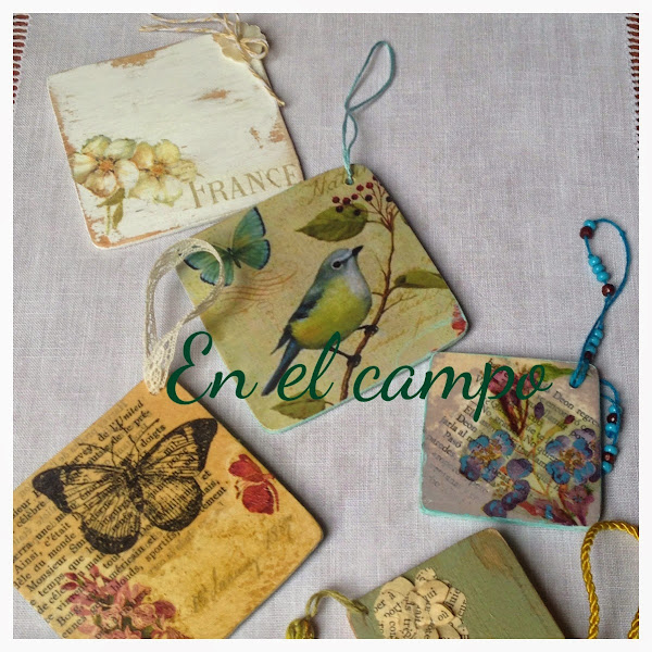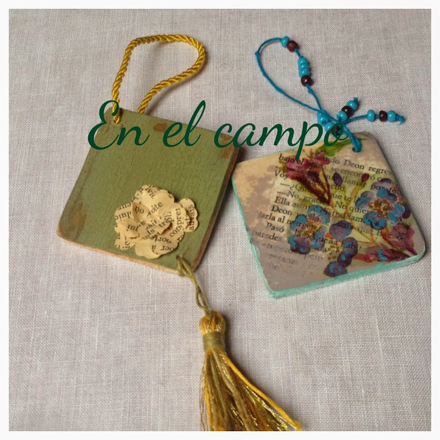 Es una forma de aprovechar restos de maderitas o de cartones y de servilletas. Un poco de pintura, cordones o cintas bonitos y algún adorno si lo quieres más vistoso, como las borlitas (las he hecho con los hilos de punto de cruz de DMC y Anchor Coats Fabra).