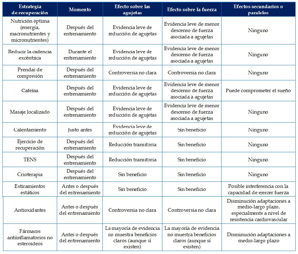 A continuación, se presenta una tabla que resume la efectividad de diferentes estrategias para aliviar o reducir las agujetas, basada en la evidencia científica actual.