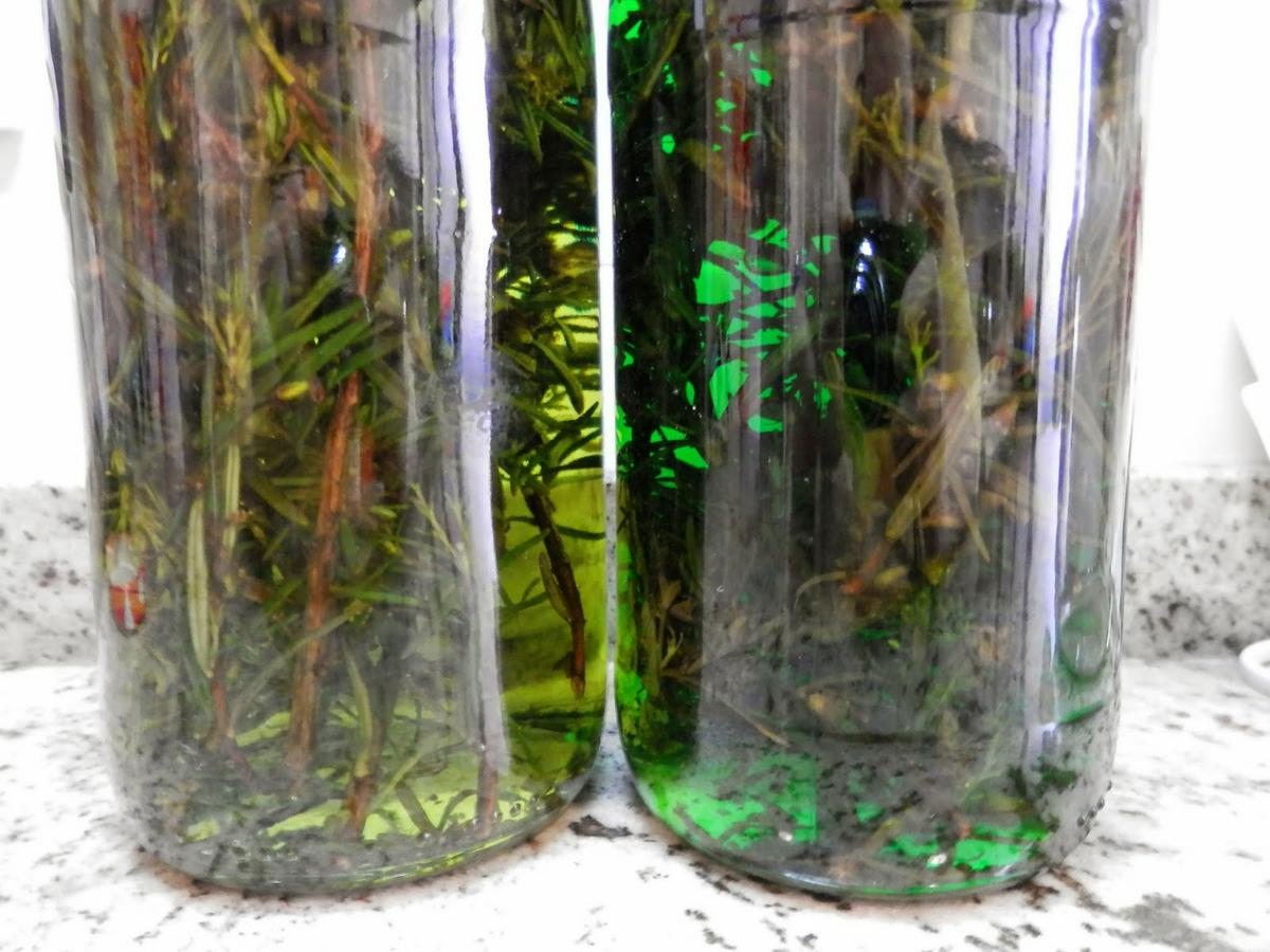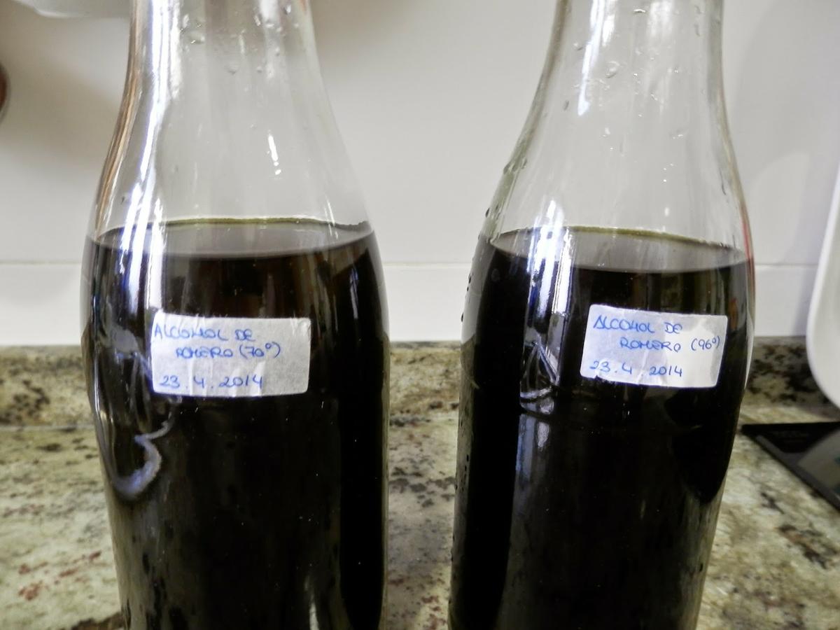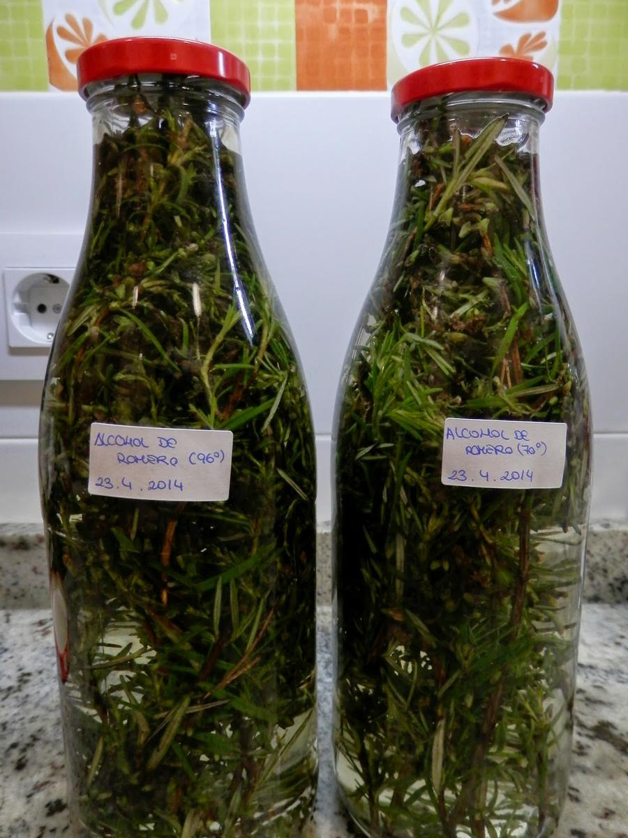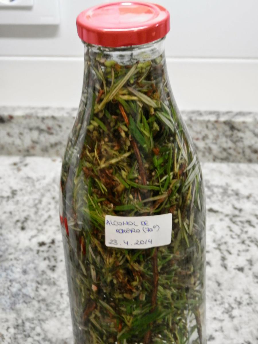 Llenamos el frasco grande con el romero con el palito y todo (la flor, la hoja y el palito) y lo cubrimos todo con el alcohol.. Dejamos dentro por cuarenta días y vamos moviendo el romero todos los días para que vaya dejando todas sus propiedades y el color. Lo dejaremos en un lugar oscuro de casa donde no le de la luz directa.
