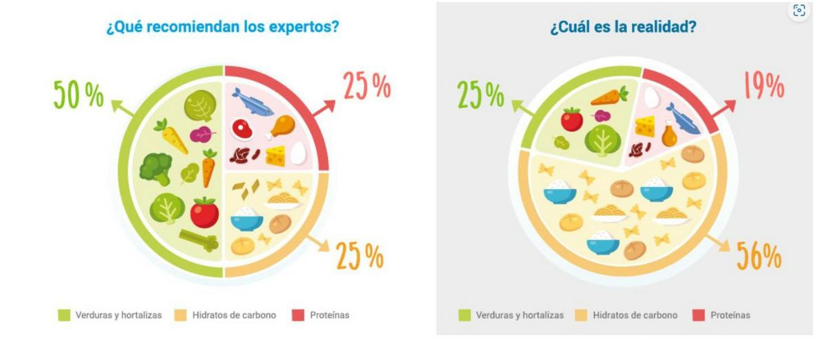 Antes se nos aconsejaba la pirámide de alimentos. La tendencia actual de combinar los tres grupos de alimentos según los nutrientes, se reflejan en el plato nutricional. La imagen es del Nutriplato Nestlé.