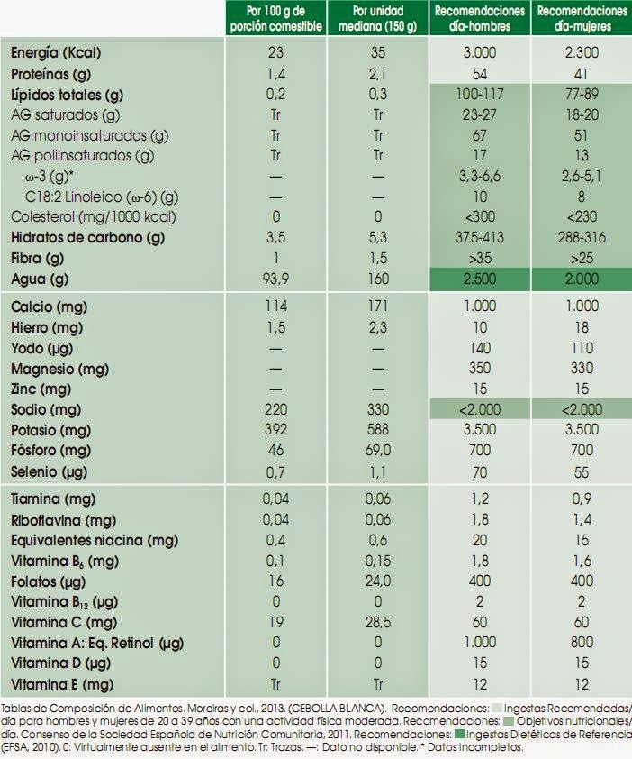 El aporte de agua es de alrededor del 90%lo que hace que las cebollas sean un alimento con escaso aporte calórico. Además, la importancia de la cebolla reside en su aporte de fibra lo que convierte a la cebolla en un alimento extraordinario en dietas de adelgazamiento ya que aporta pocas calorías y puede combinarse con cualquier plato, y la sensación de saciedad que aporta la fibra, además de la mejora del tránsito intestinal.
