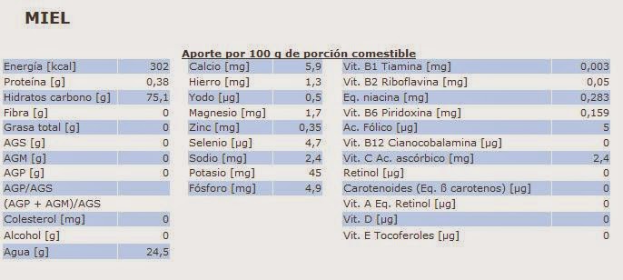 En cuanto a su valoración nutricional, la miel es un producto biológico muy complejo cuya composición nutritiva varía, como hemos dicho, según la flora de origen, e incluso la zona o el clima. Esencialmente hablamos de una disolución acuosa concentrada de azúcarinvertido, con una mezcla de otros hidratos de carbono, diversas enzimas, aminoácidos, ácidos orgánicos, minerales, sustancias aromáticas, pigmentos, ceras, etc.