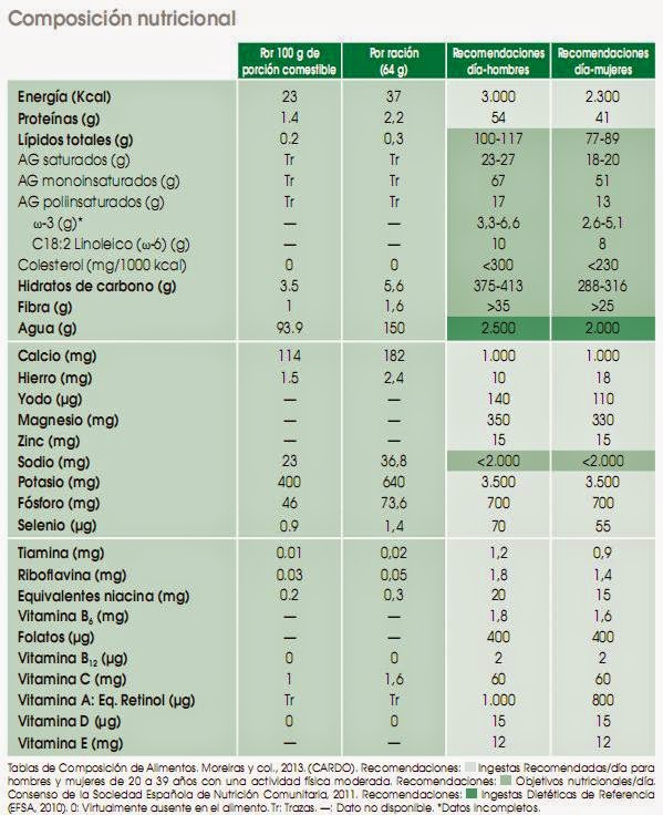 El contenido en proteínas y grasas es también bajo, aunque su contenido en agua es elevado (94%); de esto se desprende que sea una hortaliza de bajo valor calórico.