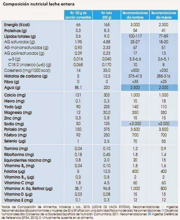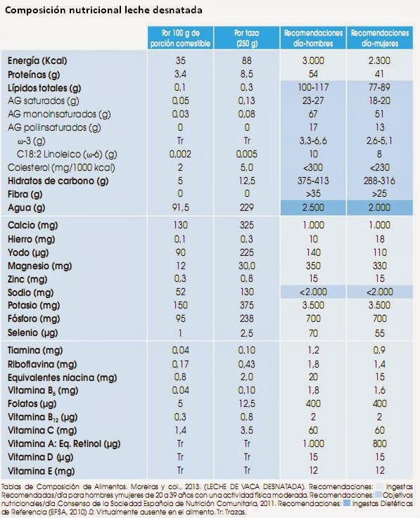 La única diferencia entre la leche entera y la leche desnatada se basa exclusivamente en su contenido en grasay, por lo tanto, en su valor calórico. A continuación podéis ver ambas tablas de composición nutricional.