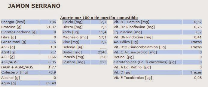 Por lo que pasamos a hablar de su valor nutricional. A este nivel, el jamón serrano es un producto bastante calórico ya que aporta 136 kcal por cada 100 gramos, no obstante, comparado con otros derivados cárnicos no es de los más energéticos; este valor calórico elevado es debido a su contenido graso principalmente.