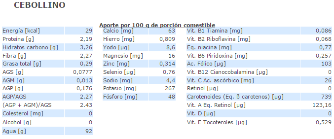 El cebollino es un alimento con un alto contenido en agua y muy bajo en energía. En cuanto a su contenido en proteínas y grasas es prácticamente nulo. Se puede destacar su contenido en vitaminas y minerales tales como la vitamina C, A y folatos, y minerales como el hierro, calcio y magnesio. De entre sus compuestos azufrados destaca la alicina, un potente agente antibacteriano, que puede usarse tópicamente como desinfectante y fungicida, aunque resulta menos efectiva que la del ajo y la cebolla por su menor concentración.