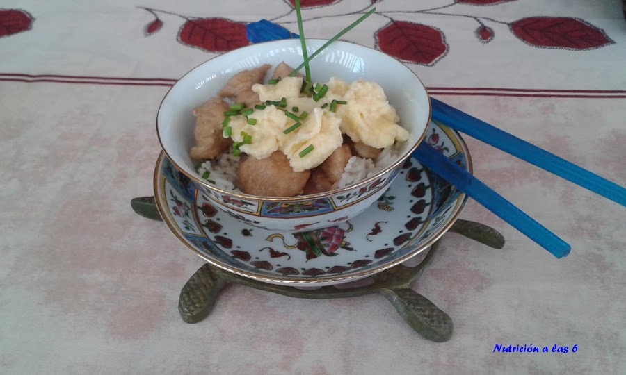 Una vez tenemos todo hecho, queda emplatar. En un bol o cuenco por persona se pone una cama de arroz y por encima se vierte el pollo y el huevo con el caldo. Se pica un poco de cebollino y se espolvorea.