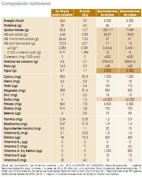 Debido a la escasa cantidad de agua que contienen, el valor calórico de las almendras, como el de todos los frutos secos, es elevado, al igual que el aporte en grasas. Cabe destacar que estas grasas son cardiosaludables, ya que estamos hablando de ácidos grasos insaturados, concretamente destaca el aporte de monoinsaturados.