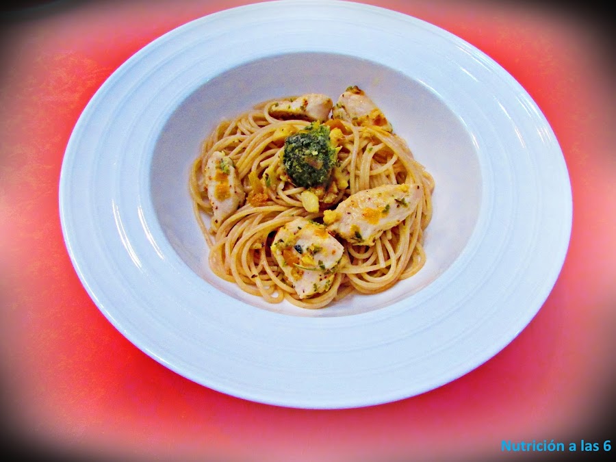 Finalmente cocemos la pasta siguiendo las instrucciones del fabricante, procurando que quede al dente y emplatamos. En un plato ponemos un poco de pasta y por encima cubrimos ligeramente con el pollo y las verduras.
