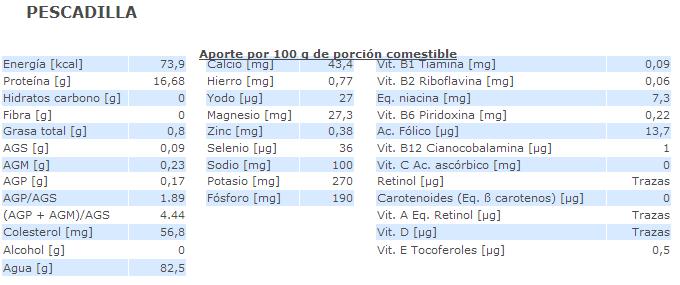 La pescadilla, al ser de menor tamaño que la merluza, presenta menos grasa (0,6 g frente a 2,8 g por 100 g de porción comestible), por lo que es un pescado blanco con un contenido calórico más bajo. No obstante, al poseer menor cantidad de grasa, el contenido en ácidos grasos omega 3 también es significativamente menor. A nivel proteico, el aporte es muy similar al de la merluza y, como en la mayoría de alimentos de origen animal, son proteínas de alto valor biológico.