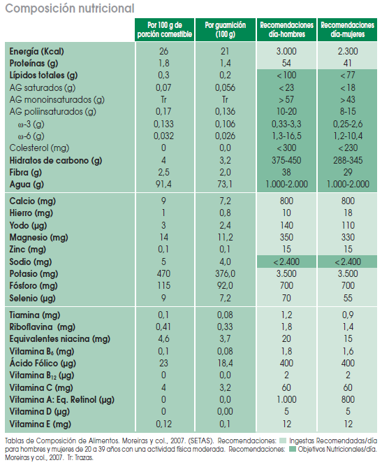 Además, son fuente significativa de vitamina A, riboflavina y niacina, y en menor grado tiamina y folatos. Respecto a los minerales, el potasio, el fósforo y el selenio son los mayoritarios, siendo menores los aportes de hierro.