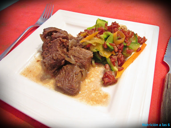 Esta carne queda muy rica acompañada de unas verduritas salteadas. En el caso del plato de hoy, la hemos acompañado con unas verduras salteadas en el wok y arroz rojo.