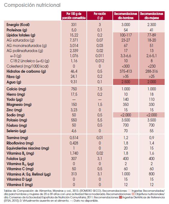 Como casi todas las especias, la ración de consumo de romero utilizada para la alimentación no suele ser superior a 1gr por lo que a nivel nutricional su aporte no es muy significativo. No obstante, podríamos destacar el hierro (2% de las IR en hombres y 1% en mujeres) y la vitamina B6 (1% de las IR para hombres y mujeres).