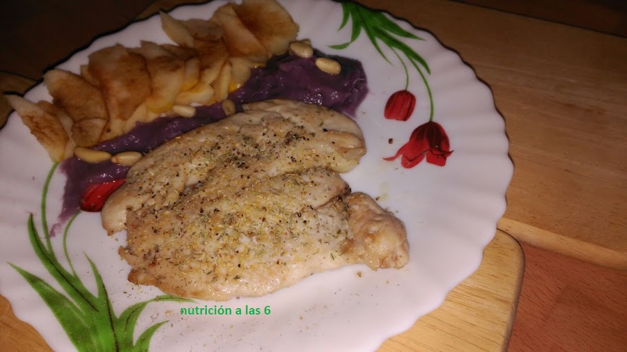 Por último sólo queda montar el conjunto, en un plato ponemos la salsa que hemos preparado y añadimos unos piñones por encima, además podemos acompañar con láminas muy finas de manzana, que bañaremos con unas gotas de vinagre balsámico. Y por último el pollo. Un plato fácil y rápido de preparar, con productos de temporada.