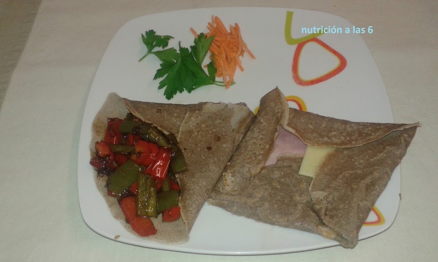Pasado el tiempo, removemos si se ha quedado muy espesa. Ponemos una sartén grande al fuego, la engrasamos con aceite de oliva y echamos una parte de la masa, extendiendo bien para que quede lo más fina posible. Dejamos cocer a fuego medio-fuerte hasta que los bordes comiencen a despegarse, en ese momento le damos la vuelta y dejamos que se haga la otra cara. En este momento añadimos el relleno, en mi caso han sido dos tipos unas de jamón y queso y otras de un salteado de verduras varias, y doblamos los bordes a modo de sobre para cerrar la crêpe y ya está lista para servir.