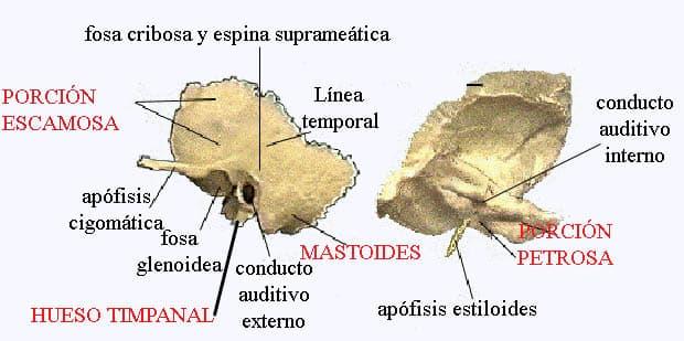 El hueso Temporal está formado por 5 partes. La porción escamosa, la porción timpánica (alberga al oído interno, medio y externo) y la apófisis petromastoidea. También por el arco cigomático (se articula con el arco temporal del malar) y la apófisis estiloides.Porción Escamosa