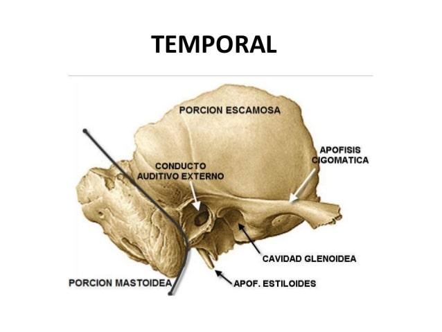 El hueso temporal forma parte de la zona lateral e inferior del cráneo. Es un hueso complejo que forma parte del sistema temporomandibular (boca) y auditivo. Este hueso es atravesado por la mayoría de los pares o nervios craneales.