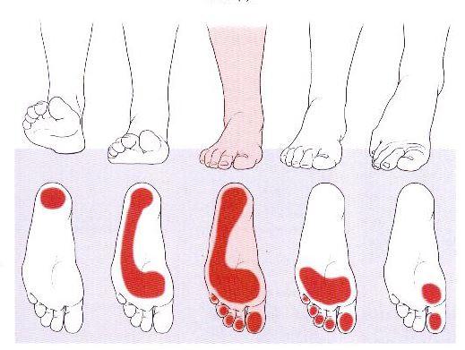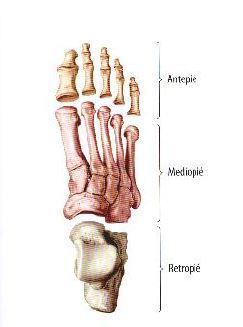 La zona anterior corresponde a la huella de los metatarsos y dedo pulgar, denominado triángulo de propulsión. La zona posterior o del talón se sitúa bajo las tuberosidades plantares del calcáneo (Lelièvre y Lelièvre, 1987).