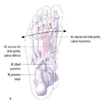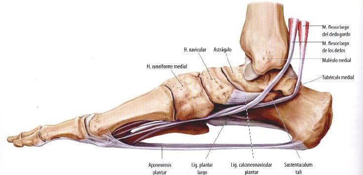 Arco interno: configura el arco visible del pie. Se inicia en el calcáneo, sube al astrágalo, llega a su culmen en el escafoides y baja a la altura de los sesamoideos y el primer metatarsiano (Arévalo, 2013). Es un arco exclusivamente osteoligamentoso, donde la musculatura del pie no desempeña ningún papel directo. Por ello está reforzado por la gran aponeurosis plantar (Lelièvre y Lelièvre, 1987).