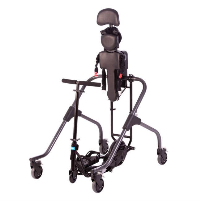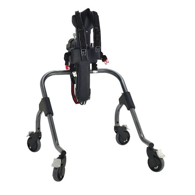 Su armazón con ruedas permite que los niños se muevan utilizando las extremidades inferiores gracias a la incorporación de un arnés de tronco con soporte de hombros que ofrece la estabilidad necesaria para ayudar en el control de cabeza y movimiento de las extremidades superiores, permitiendo a los niños dejar las manos libres para jugar y explorar.