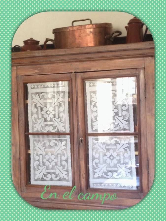 He recuperado la antigua alacena de pueblo que teníamos guardada. No es un mueble de gran calidad, está hecho con listones de madera de pino a trozos (algunos necesitarían pegarse mejor o incluso introducir un liston para unirlos). Pero a nosotros nos encanta, y la hemos dejado tal cual, sin restaurar. Sólo un cambio de aspecto:, lavado, lijado, aclarar la madera para unificar un poco el color, y una pátina blanca. Como remate, los visillos de ganchilllo que ha hecho mi madre, creo que le dan un aspecto totalmente entrañable y familiar. El resultado: rústico pero shabby. Espero que os guste.Antes.