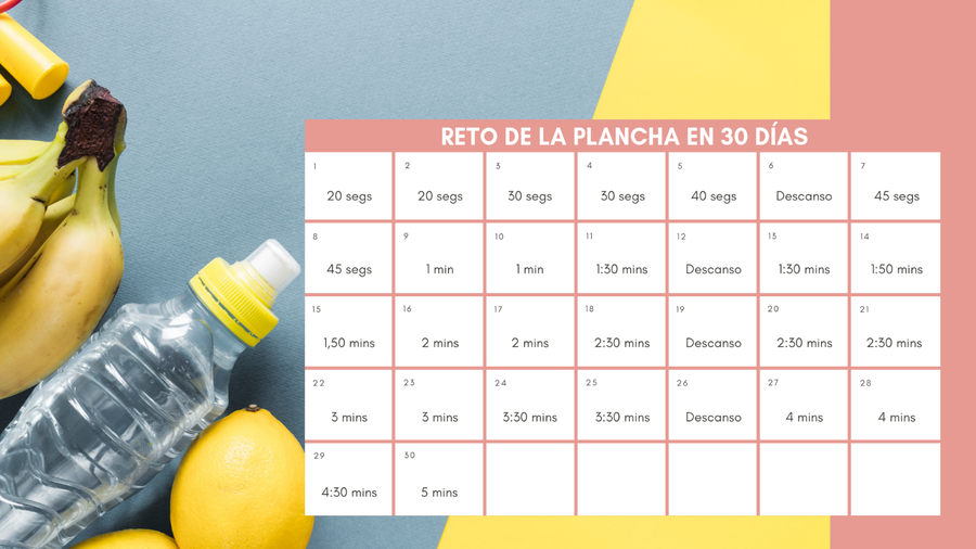 Por tanto, este apartado se dividiría en 2 y te regalamos un reto extra: primero, la práctica de ejercicio 3 o 4 días a la semana y, segundo, el reto de la plancha, a través del cual irás aumentando el tiempo en el que mantengas esta postura hasta alcanzar los 5 minutos. Mira:
