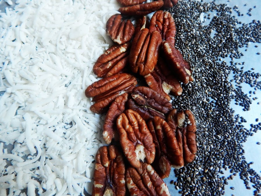 Yo utilicé coco rayado, nueces y semillas chía, por que es lo que tenía en casa. Hay un sin fin de variantes que pueden hacer. En caso de que tengan oportunidad de conseguir la chía, se las recomiendo, ya que es otro de los ingredientes estrellas en estas barras, hace que nuestras barras sean muy crocantes y sobre todo más saludables, ya que están cargadas de calcio, antioxidantes, proteína, hierro, fibra, potasio, omega 3. y por si fuera poco controla los antojos. ¡Un sin fin de beneficios!