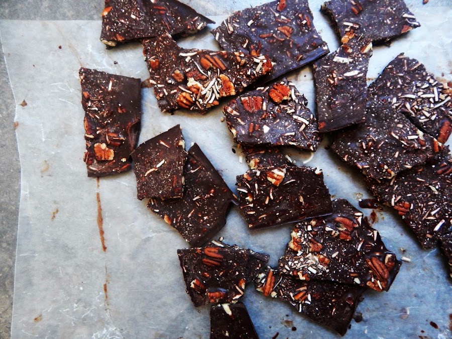 Combinamos en un bowl pequeño el aceite de coco, miel, cocoa (en caso de que tenga grupos, cernir la cocoa) y la pizca de sal. Vaciamos el chocolate en el molde, debe tener un espesor de poco más de medio centímetro y por encima ponemos el coco, nueces y la chía. Llevamos al congelador por 15 a 25 minutos, hasta que este firme. Troceamos el chocolate. Ya esta lito para comer.