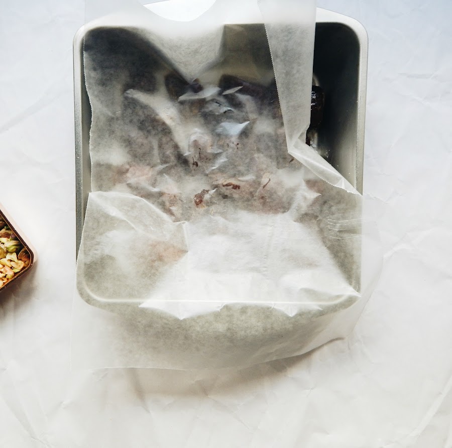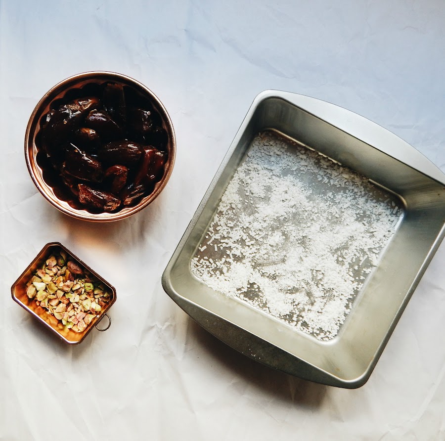 En un molde cuadrado de 20 cm ponemos las 2 cucharadas de coco y acomodamos los dátiles. Ponemos encima un trozo de papel encerado y presionamos con nuestras manos hasta llenar todos los huequitos del molde y formar la base de nuestras barras, quitamos el papel encerado y espolvoreamos los pistachios y las 2 cucharaditas de coco rallado, presionamos un poco para que se incrusten en los dátiles.