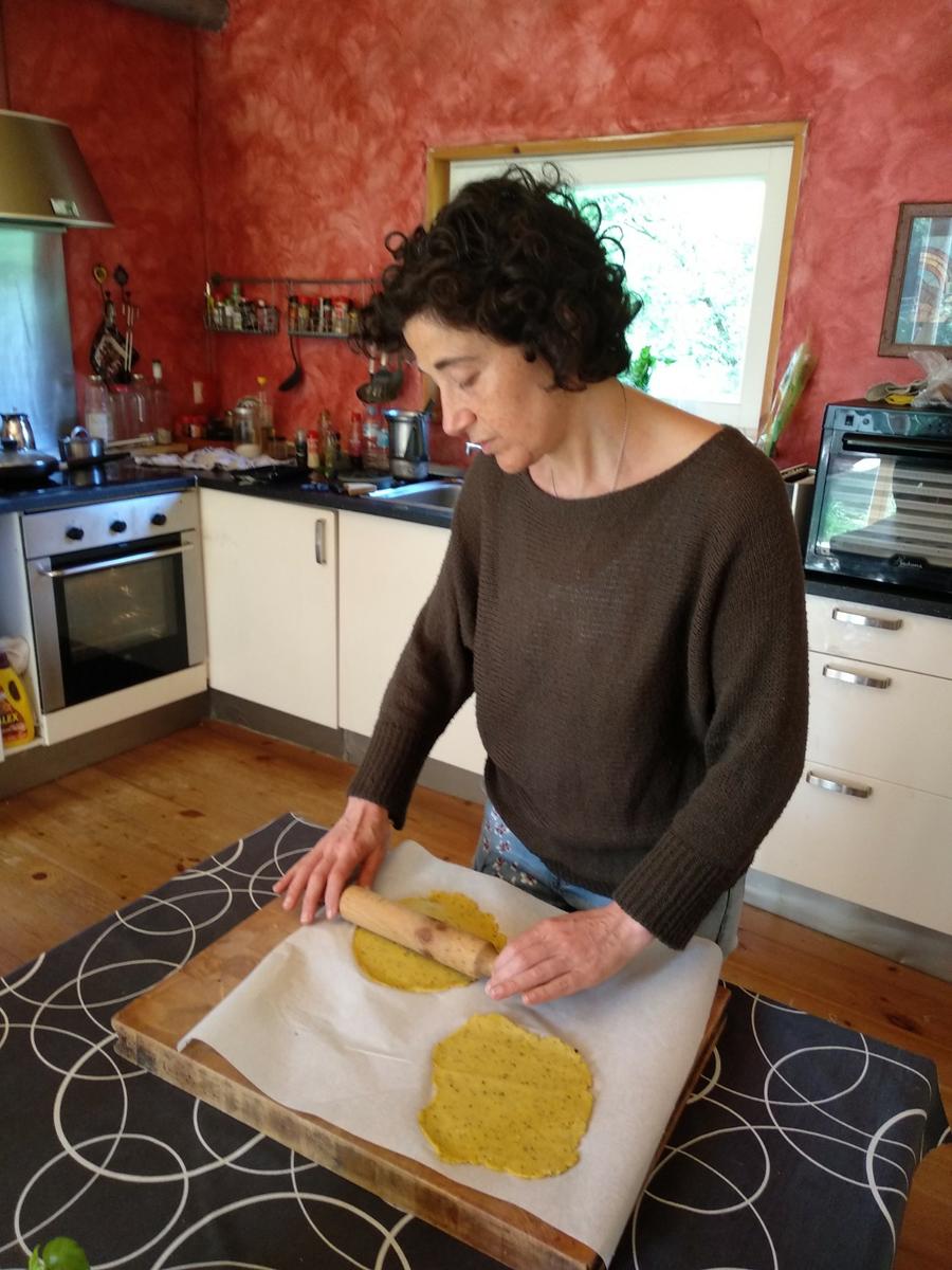Coloca cada bola sobre un papel de hornear y extiendela con un rodillo. Para que no se te enganche moja la bola ligeramente con agua.