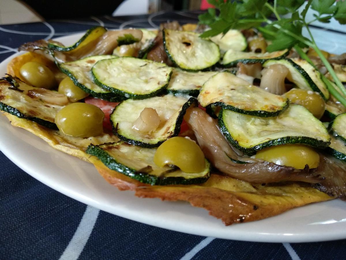 Añadir los toppings que queramos: verduras salteadas (calabacín en rodajas, espárragos,…), hojas de rúcula, aceitunas, alcaparras…