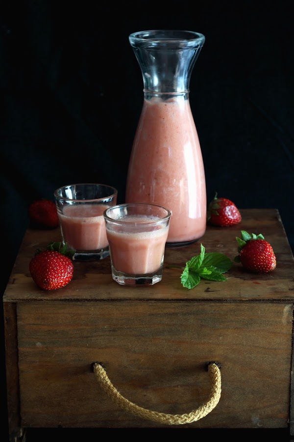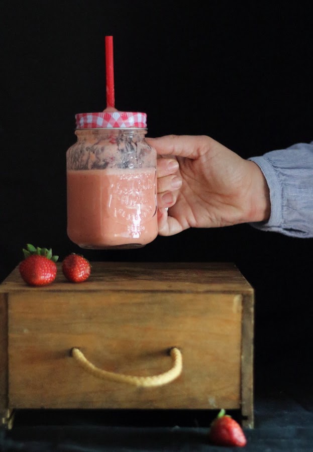 En el vaso de la batidora, ponemos todos los ingredientes y trituramos. Si queréis un batido más fino, se puede colar.