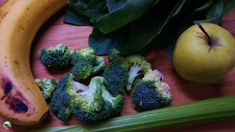 Batido verde, elaboración:1.- Lavamos bien las verduras y la manzana, lo trocemos todo y ponemos en el vaso de la batidora o licuadora. Pelamos el plátano y lo incorporamos. Vertemos un vaso de agua y lo batimos bien todo. Repartimos en vasos y decoramos con una rama de apio.