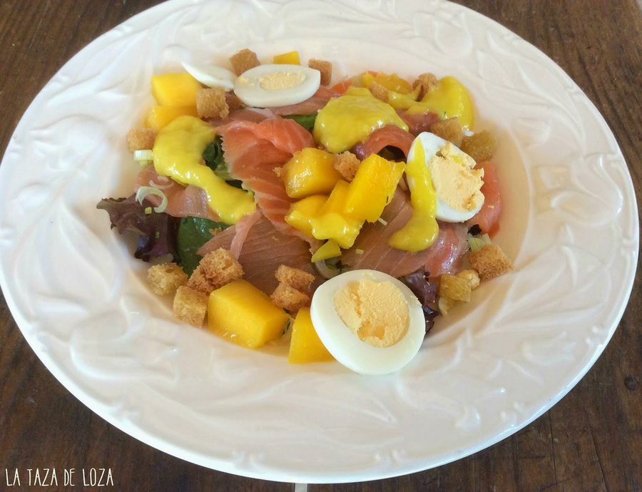 En el blog la Taza de Loza podemos encontrar una deliciosa ensalada con mango, salmón, lechuga y otros ingredientes y una salsa también elaborada con mango. Puedes ver al detalle su preparación haciendo clic a continuación: