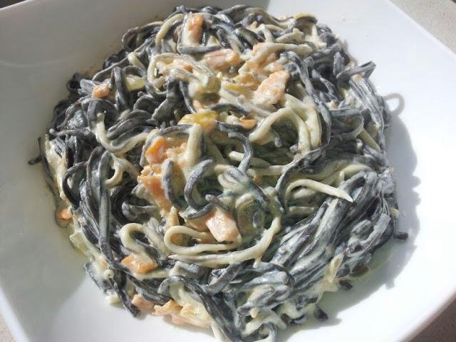 Ver Receta Tagliatelle Negros con Salmón y angulas sucedáneas