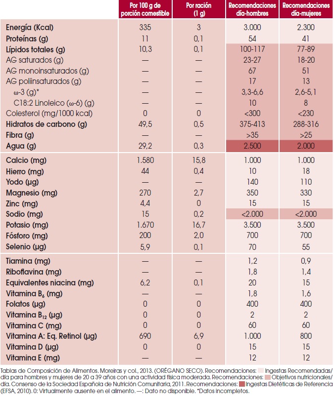 Aunque se puede decir muchas de las especias y plantas aromáticas, como es el caso del orégano, son ricas en hierro y calcio, la realidad es que debido a la ración de consumo, es decir, se ingiere una pizca, la cantidad que aportan de estos dos minerales no representa significación, aún así, se debe comentar.