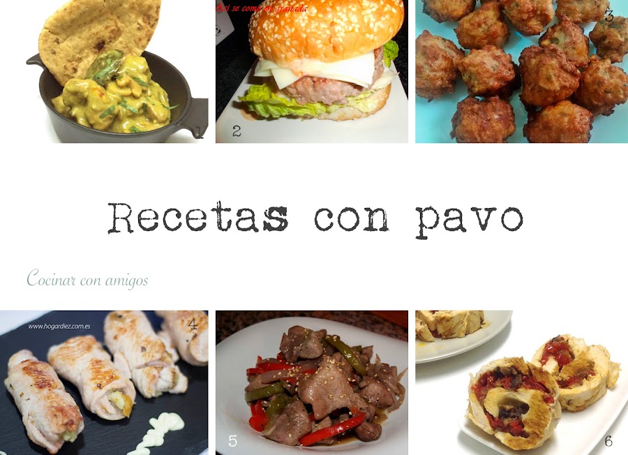 Desde mi blog os traigo una receta de pavo garam masala (1) típica de la cocina Hindú, una receta deliciosa cargada de aromas. Desde la cocina de Elvira, Así se come en Granada nos llega una fantástica hamburguesa de pavo y pollo (2) para cuando queremos un capricho más sano. En el blog Que rico! de Fran encontramos esta receta de pavo con pimientos al curry (5) otra maravillosa receta asiática.