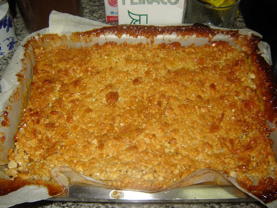 -Sacamos del horno y extendemos por encima la mezcla de las almendras reservadas en el bol.