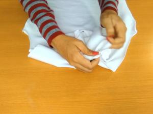 Seguidamente fijamos con nuestros alfileres la parte de adelante, guardando un margen de aproximadamente 2 cm del borde de la blusa.