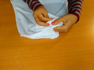 Fijaremos con ayuda de nuestros alfileres la pieza, acomodando ésta sobre la costura que hemos realizado anteriormente y con mucho cuidado y lentamente realizaremos este paso.